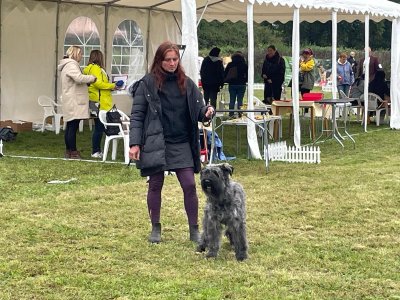 pes správné velikosti i substance, výborně modelovaná hlava, s krásnou čenichovou partii, výborné ucho, tmavé oko, velmi pěkná přední fronta, správný rovný pevný hřbet, typické zauhlení pánevních končetin, hrubá srst, v kratším střihu, velmi pěkný prostorný pohyb,
